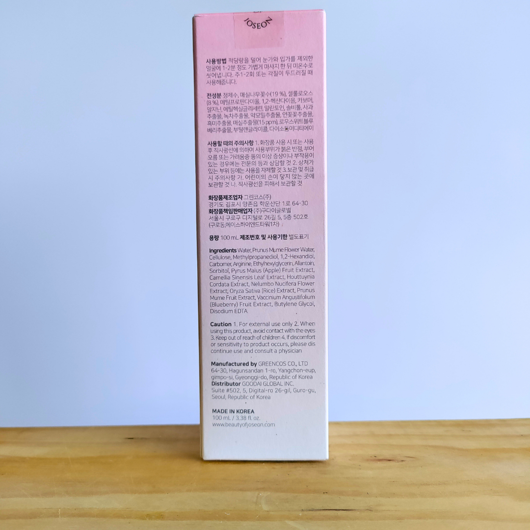 Water, Prunus Mume Flower Water, Cellulose, Methypropandiol, 1,2-Hexandiol, Carbomer, Arginine, Ethylhexylglycerin, Allantoin, Sorbitol, Disodium EDTA, Pyrus Malus (Apple) Fruit Extract, Camellia Sinensis Leaf Extract, Houttuynia Cordata Extract, Nelumbo Nucifera Flower Extract, Oryza Sativa (Rice) Extract, Prunus Mume Fruit Extract, Vaccinium Angustifolium (Blueberry) Fruit Extract, Butylene Glycol