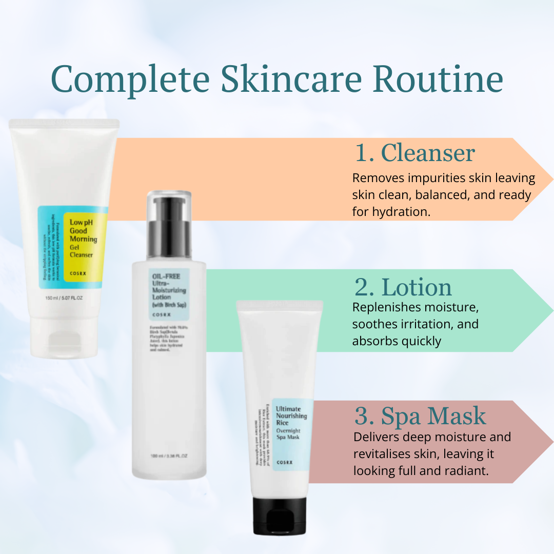This COSRX skincare set delivers a complete routine that focuses on gentle cleansing, lightweight hydration, and overnight nourishment. This set is perfect for those seeking a simplified yet effective routine to keep skin fresh and glowing.