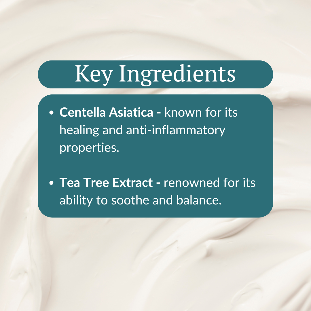 Centella asiatica is known for its healing and anti-inflammatory properties, and tea tree extract, renowned for its ability to soothe and balance. Together, this cream helps to reduce redness, calm irritated skin and restore skin's water oil balance.
