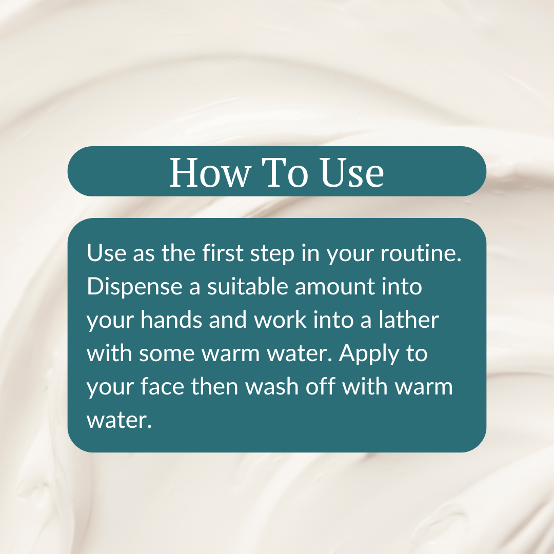Use as the first step in your routine. Dispense a suitable amount into your hands and work into a lather with some warm water. Apply to your face then wash off with warm water.
