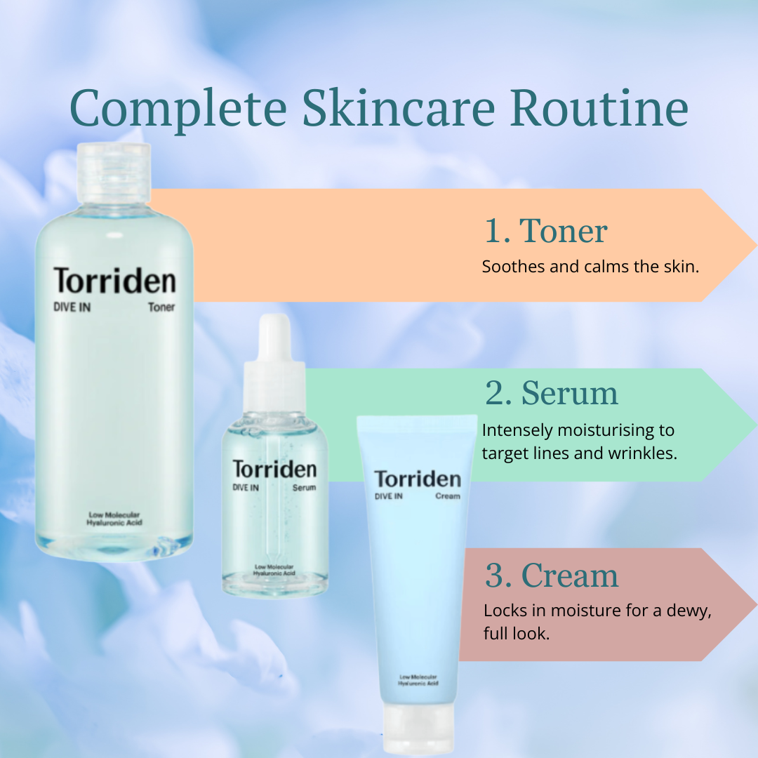 1. Torriden DIVE-IN Low Molecular Hyaluronic Toner 300m: Start with this soothing and calming toner to balance your skin's moisture levels.